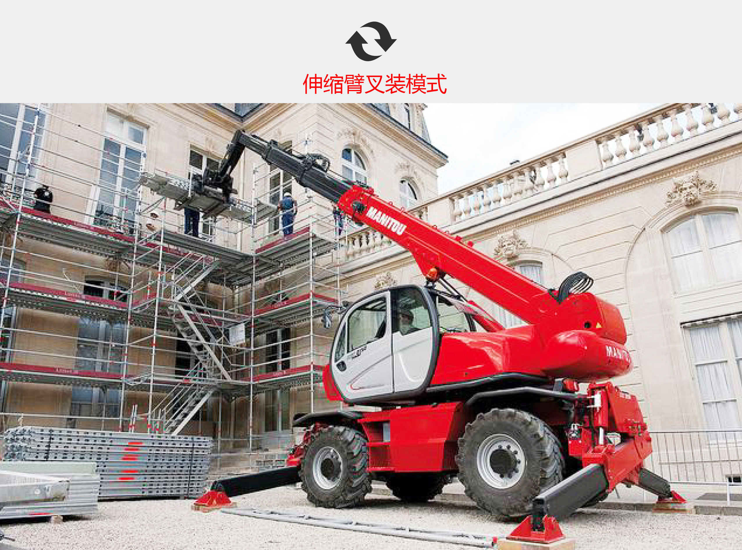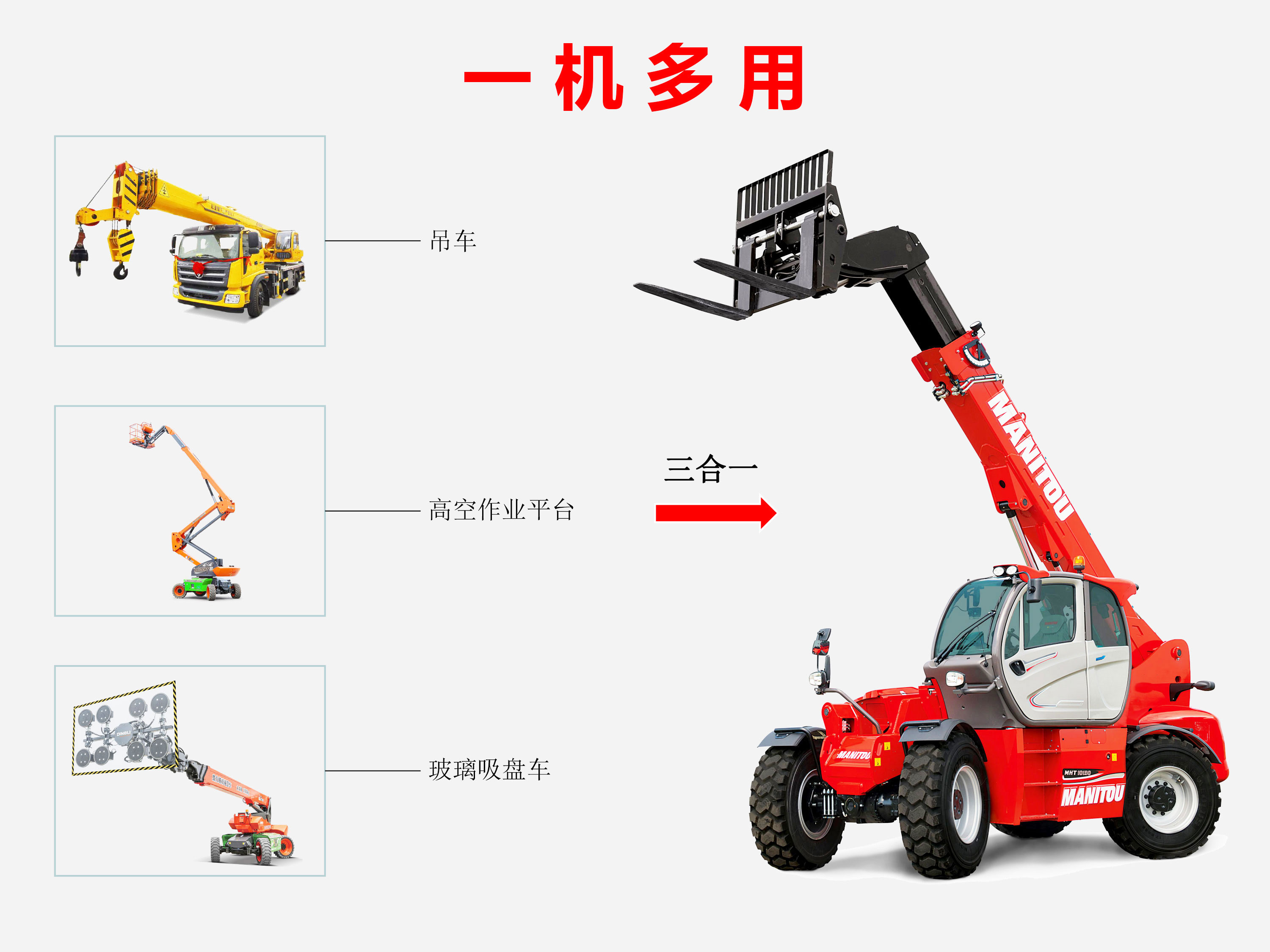 ? 使用一臺3合1設(shè)備(伸縮臂叉裝車,起重機和高空作業(yè)平臺)。